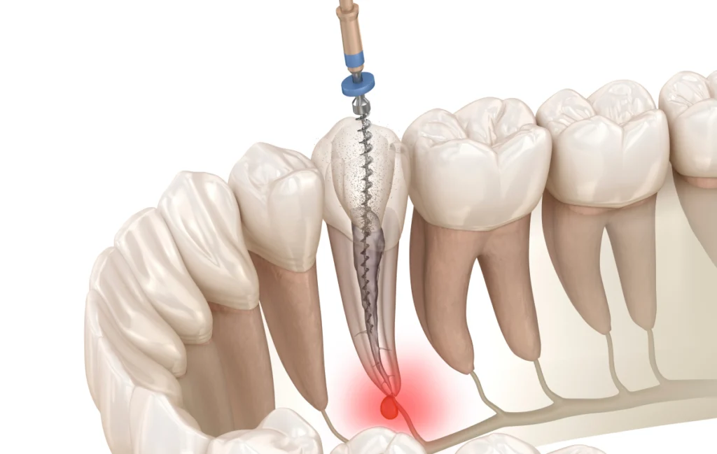 À l’aide d’instruments spécifiques, la pulpe est retirée. Les canaux sont ensuite nettoyés, désinfectés et mis en forme. Cette étape vise à éliminer les bactéries et à préparer l’espace pour la suite du traitement.